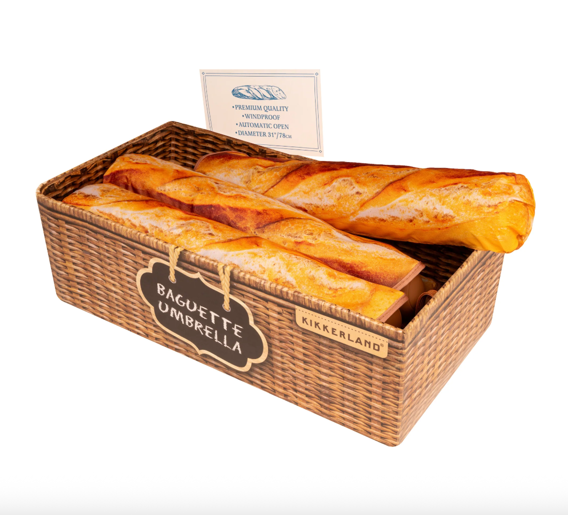 Stay stylish and dry with this high quality, auto open, windproof baguette umbrella, featuring a tan canopy and printed sleeve.