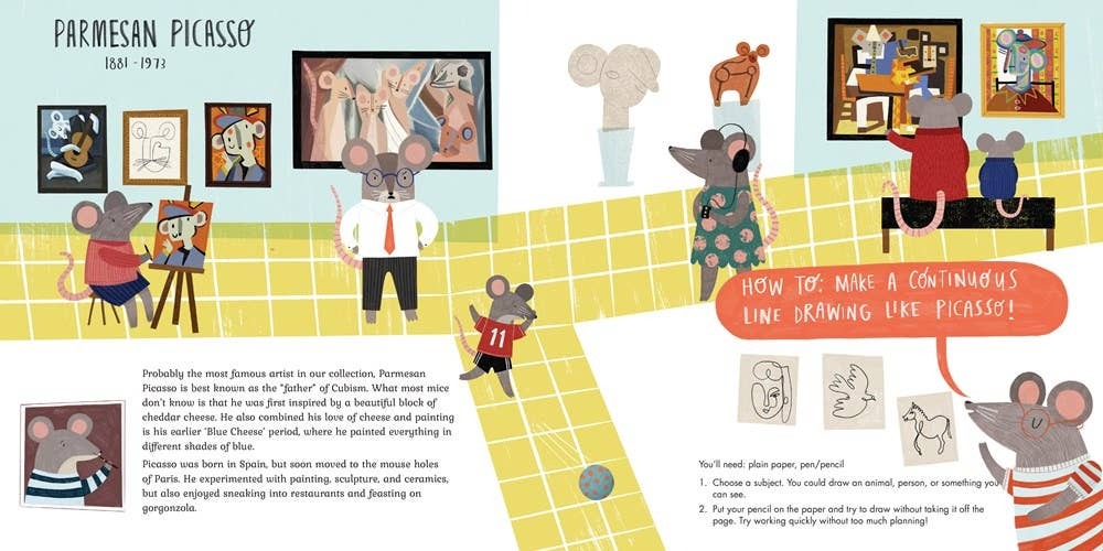 The Marcel's Mouse Museum is home to paintings and sculptures by the most famous mice of the last one hundred years, from Parmesan Picasso to Gouda Kahlo. Take a tour of mouse art history and styles with Curator Marcel and learn about art movements and styles like Cubism, self-portraits, Pop Art, and many more that have influenced art today. And we can’t forget the cheesy fun facts and activities that go with them! With adorable mice drawn in famous artwork and an entertaining mix of mouse humor and history facts, Marcel's Mouse Museum is both educational and fun! Plus, each artist comes with an activity to try at home, perfect for inspiring the artist in everyone. The entire experience will be un-brie-lievable!