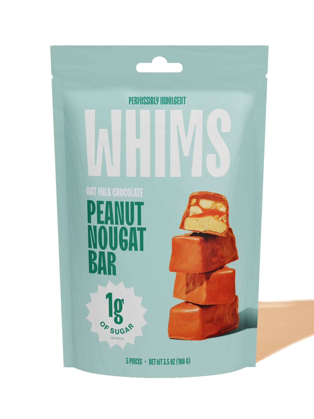 The Whims Oat Milk Chocolate Peanut Nougat Bar brings all the craveable textures your customers will love—chewy nougat, crunchy peanuts, and creamy oat milk chocolate—with none of the sugar overload.