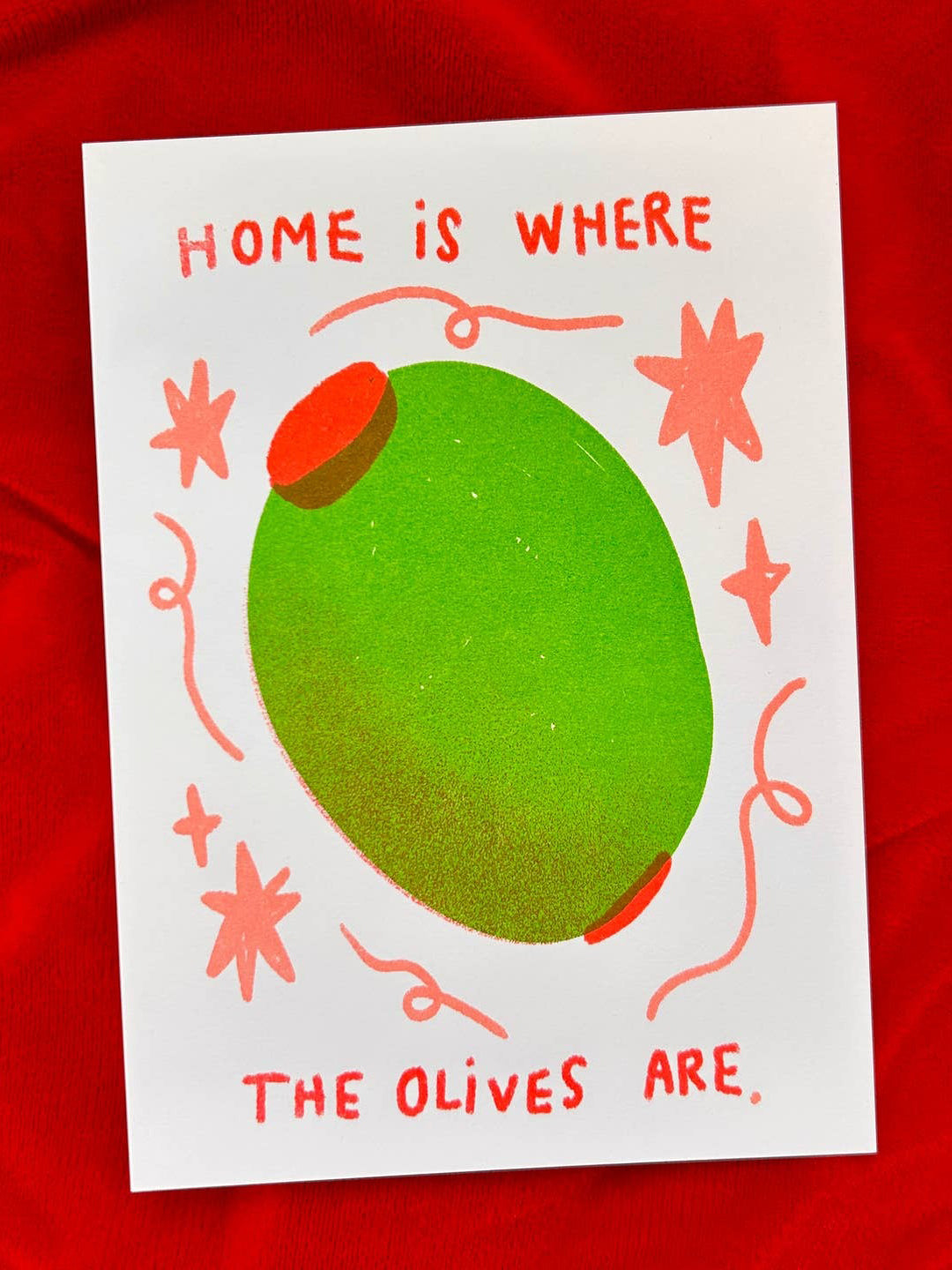 5x7" risograph print featuring a gorgeous pimento olive! Whether you love castelvetranos or kalamatas this print is great for your kitchen space! Italian pantry vibes all the way down! Olive girl summer lets go! Home is where the olives are :)