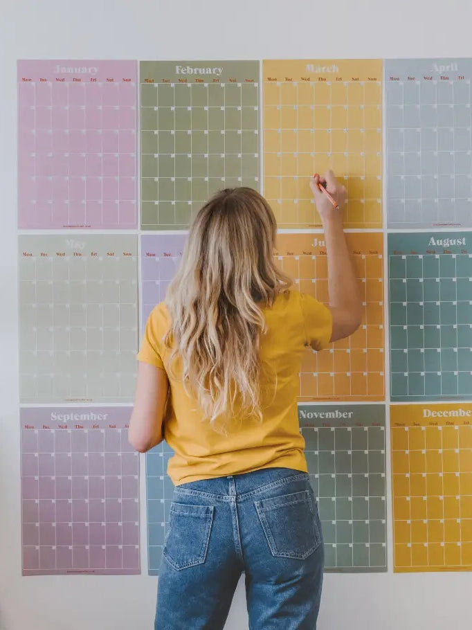 This calendar is desirable all year round, as the user adds the dates in as they need. A 12-page, undated planner which can be hung as a large wall planner or as individual A3 prints. Sweet, fun colors in modern typography with a minimalist inspired grid. It's 100% recycled and comes packaged in environmentally friendly packaging—a recycled board backing and clear plastic free sleeve—with a sticker to show the full product spec and visual. Please note: the week starts Monday.